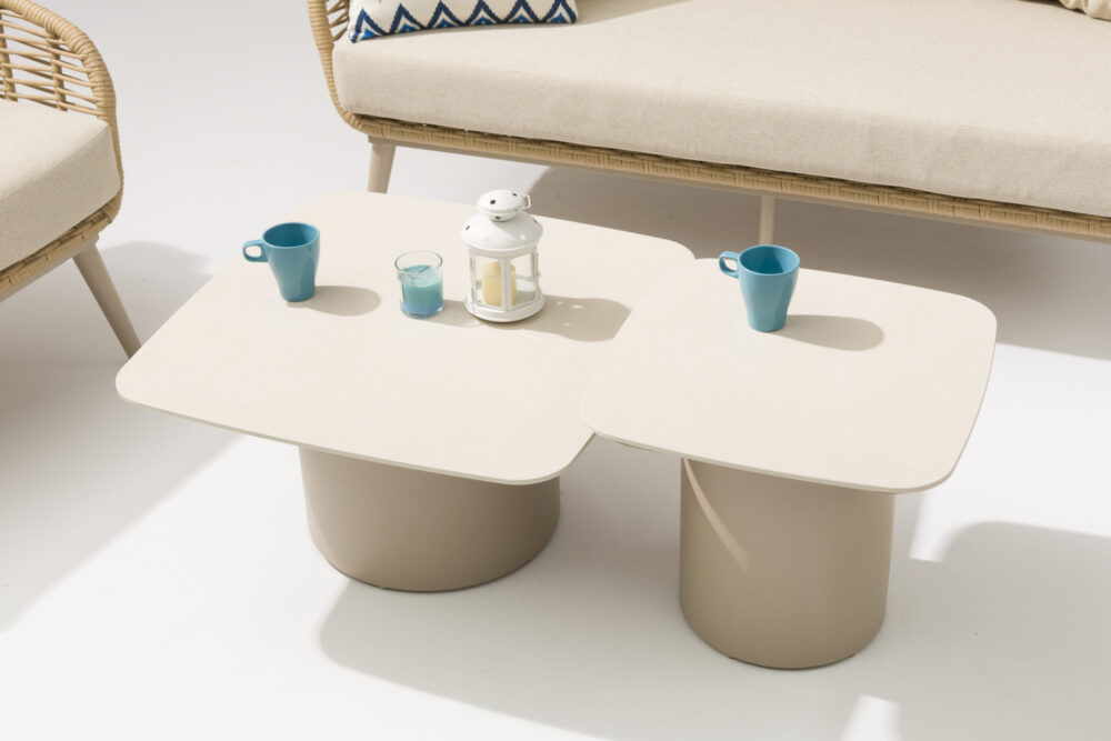 Set stolića ANCONA predstavlja savršen dodatak svakom modernom vrtu, terasi ili lounge prostoru. Njihov čist, minimalistički dizajn u toploj bež nijansi unosi osjećaj smirenosti i sofisticiranosti, lako se uklapajući uz različite stilove vanjskog namještaja.