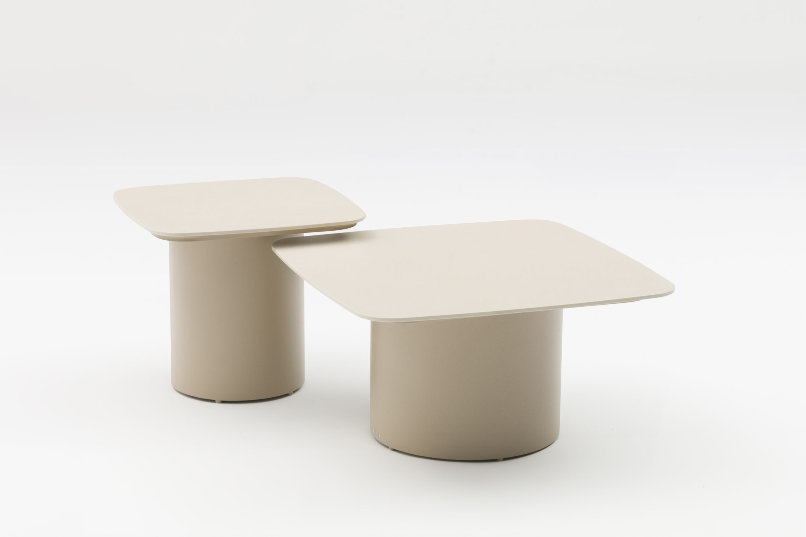 Stolići su dizajnirani u dvije različite visine, što omogućava praktično kombiniranje i fleksibilno korištenje – zajedno ili odvojeno, prema vašim potrebama. Stabilna cilindrična baza osigurava čvrstoću, dok blago zaobljeni rubovi ploča doprinose elegantnom i sigurnom korištenju.