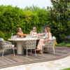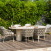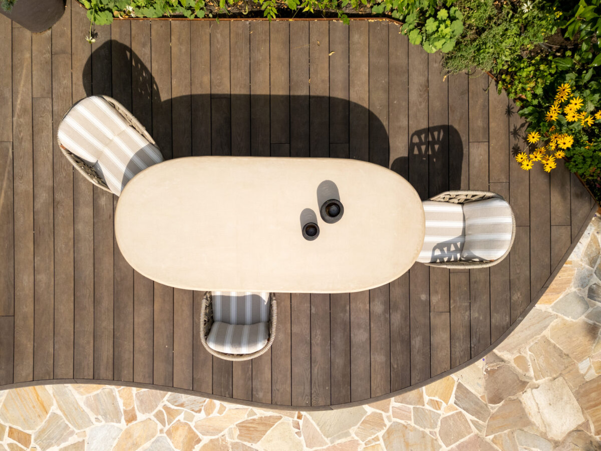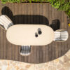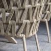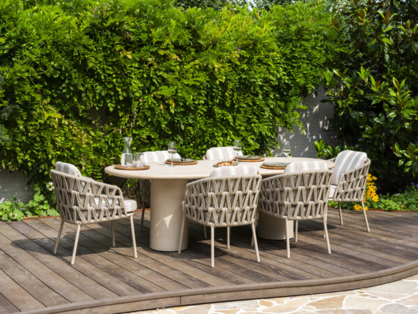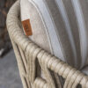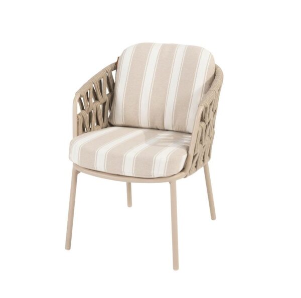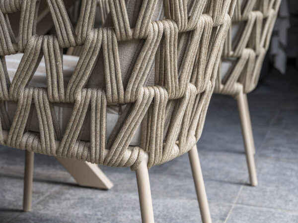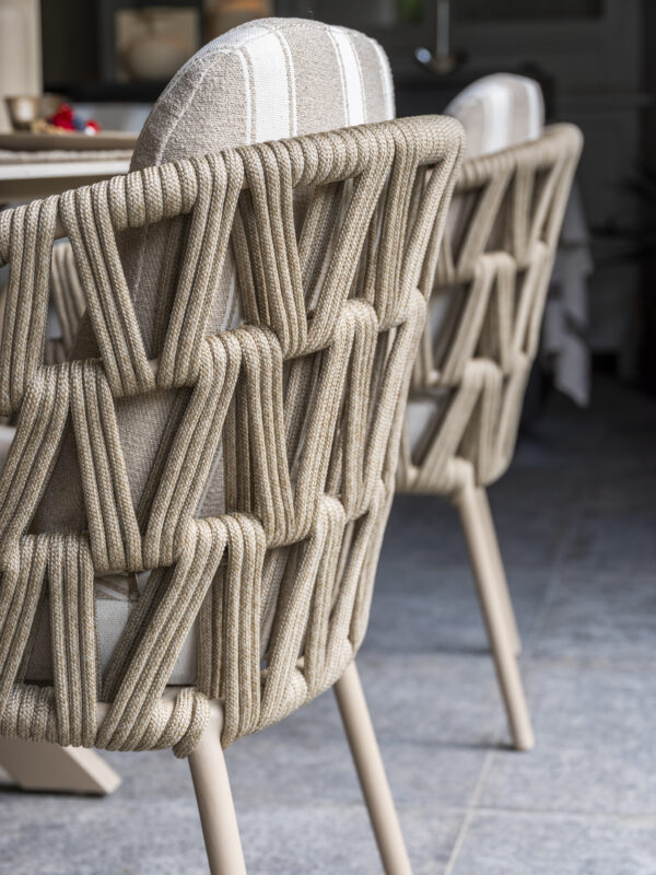 Mekani sjedeći i naslonski jastuci s presvlakama od Olefina pružaju iznimnu udobnost, dok čvrsta konstrukcija i elegantni pleteni bočni detalji osiguravaju stabilnost i trajnost. Tkanine ne samo da su prekrasno mekane, već su i iznimno čvrste, 100% otporne na vremenske uvjete i lako se čiste! Osim estetske privlačnosti, prugasti dizajn ima i praktičnu prednost jer vizualno skriva sitne tragove korištenja. Stolica Beverly idealan je izbor za one koji žele spoj dizajna, udobnosti i diskretnog luksuza u svakodnevnom prostoru.