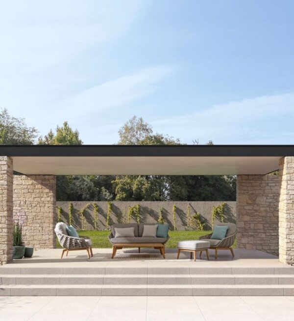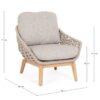 Konstrukcija je izrađena od aluminija s praškastim premazom i pletena polipropilenskim užetom. Noge su izrađene od masivne tikovine. Uklonjivi jastuci sjedala i naslona, izrađeni od olefina otpornog na sunce (100% polipropilen), nisu samo vrlo udobni već su i otporni na sunčevu svjetlost i vlagu .