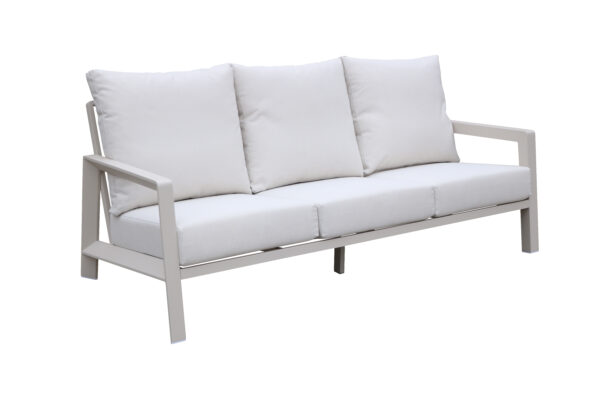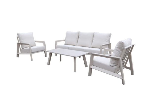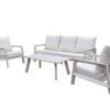 Garnitura se sastoji od udobnog trosjeda, dvije fotelje i elegantnog stolića, osiguravajući maksimalnu udobnost i funkcionalnost za opuštanje ili druženje. Mekani jastuci pružaju izuzetnu udobnost, dok čvrsta i stabilna konstrukcija garantira dugotrajnost i otpornost na vanjske utjecaje.