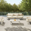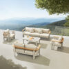 Garnitura uključuje trosjed, 2 fotelje i praktičan stolić za kavu te uključenim jastucima za sjedenje što je čini idealnim izborom za opuštanje, druženja i uživanje na terasi, u vrtu ili uz bazen.