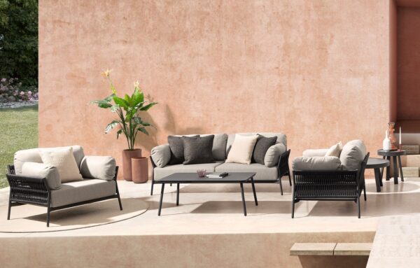 Garnitura Pardis sastoji se od dvosjeda,dviju fotelja i stolića, zabavna je a istovremeno elegantna kombinacija aluminijskog okvira, u antracit sivoj boji  s puder premazom, opletenog kvalitetnim pletivom od špage namijenjene vanjskim prostorima( Olefinska tkanina).Posebno udubni jastuci izrađeni od Olefin tkanine otporne na vanjske uvjete, imaju mogućnost skidanja navlaka.Pardis je garnitura iznimno mekih jastuka s posebnim naglaskom na detalje, čime mami na opušteni  odmor u vrtu ili na terasi.