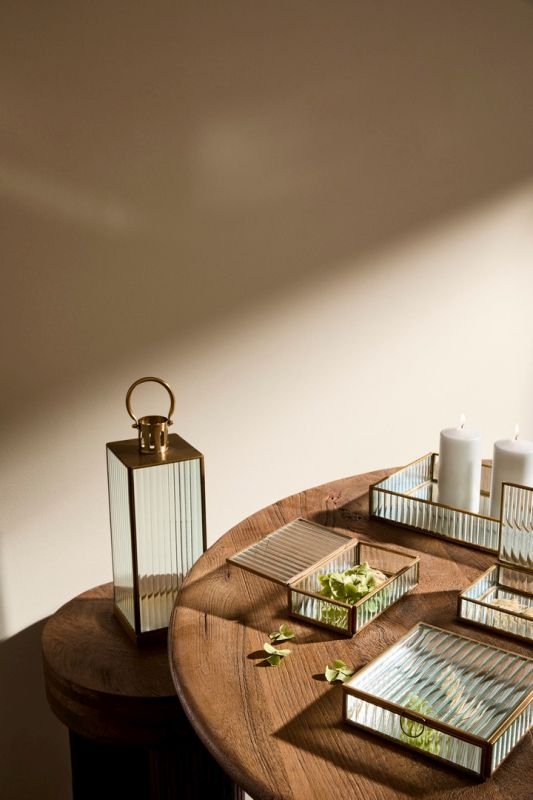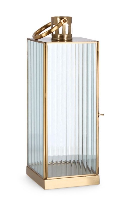 Ova elegantna zlatna lanterna s rebrastim staklom donosi luksuzan i sofisticiran izgled u svaki prostor.