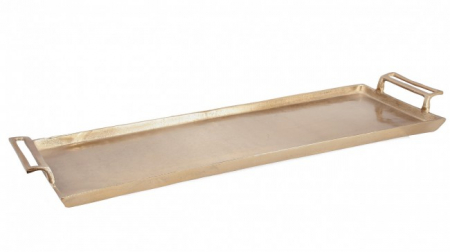Elegantan i moderan dekorativni pladanj u zlatnoj boji, izrađen s čistim linijama i čvrstim ručkama za lako prenošenje.