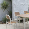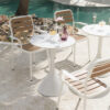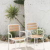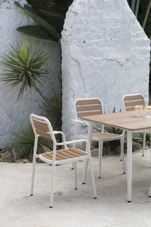 Ova elegantna stolica Alegra osmišljena je za prostore u kojima se stil i praktičnost podjednako cijene. Čista bijela konstrukcija u kombinaciji s toplim drvenim letvicama stvara svjež, mediteranski izgled koji savršeno pristaje terasama, bazenima, blagavaonicama, ali i ugostiteljskim objektima.