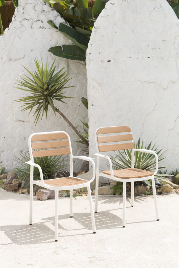 Ova elegantna stolica Alegra osmišljena je za prostore u kojima se stil i praktičnost podjednako cijene. Čista bijela konstrukcija u kombinaciji s toplim drvenim letvicama stvara svjež, mediteranski izgled koji savršeno pristaje terasama, bazenima, blagavaonicama, ali i ugostiteljskim objektima.