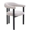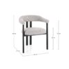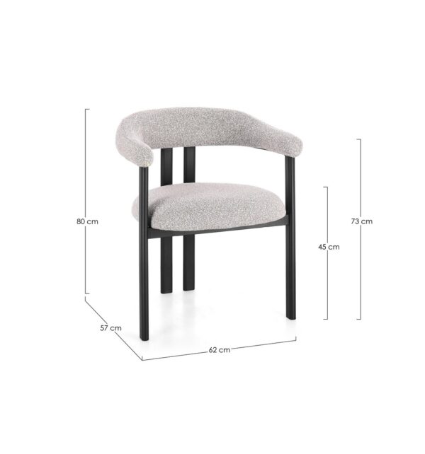 Struktura je izrađena od čelika s izdržljivim epoksidnim premazom, što osigurava stabilnost i dugotrajnost. Sjedalo i nasloni presvučeni su poliesterskom tkaninom s bouclé efektom, pružajući meku teksturu i dodatnu udobnost. Poliuretanska pjena visoke gustoće (sjedalo 24–28 kg/m³, nasloni 22–24 kg/m³) garantira udobno sjedenje i optimalnu potporu.