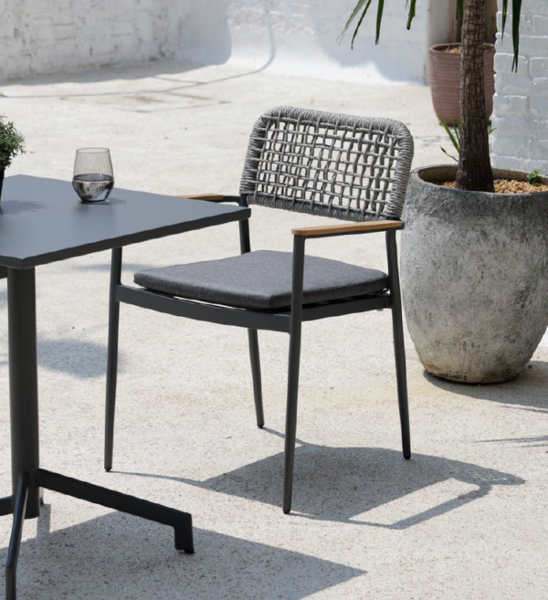 Unesite sofisticiran stil i vrhunsku udobnost u svoj eksterijer uz ovu elegantnu stolicu Reta modernog dizajna. Čiste linije, čvrsta metalna konstrukcija i ručno pleteni naslon čine je idealnim izborom za terase, blagavaonice, balkone, ali i za ugostiteljske prostore.