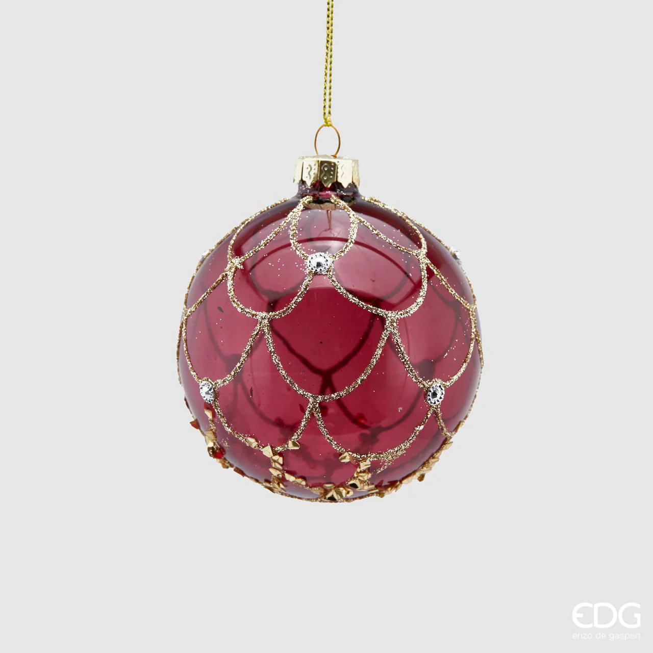 Ukrasna kuglica za bor u crvenoj boji kombiniranoj sa zlatnim detaljima, izrađena od stakla s detaljima od željeza, ukrašena ornamentima od perlica.”